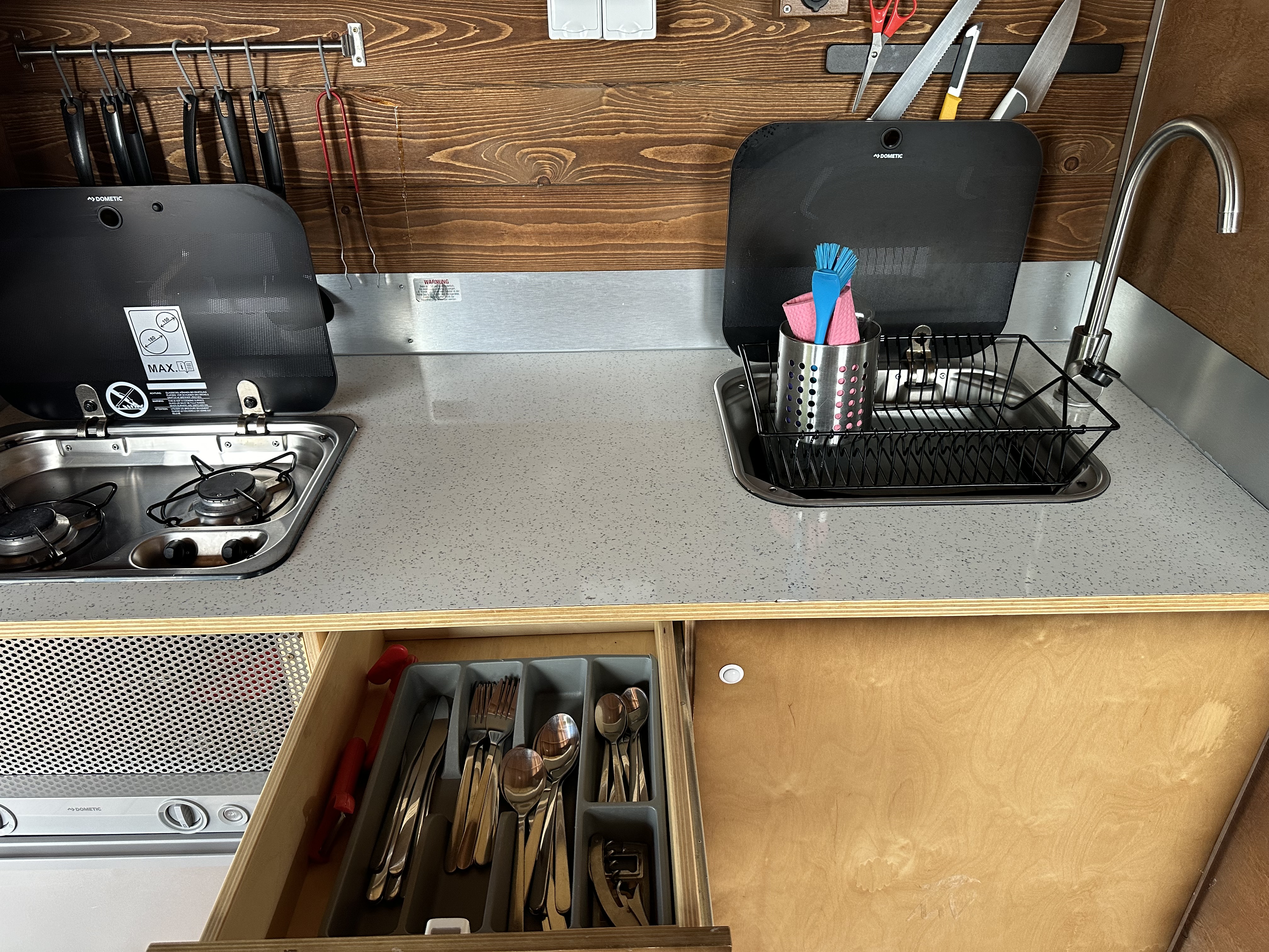 * Küchenzeile (0,80 x 2,00m) mit Gaskühlschrank, 2-Flammen-Gasherd und ein Spülbecken mit fließend kaltem Wasser.
